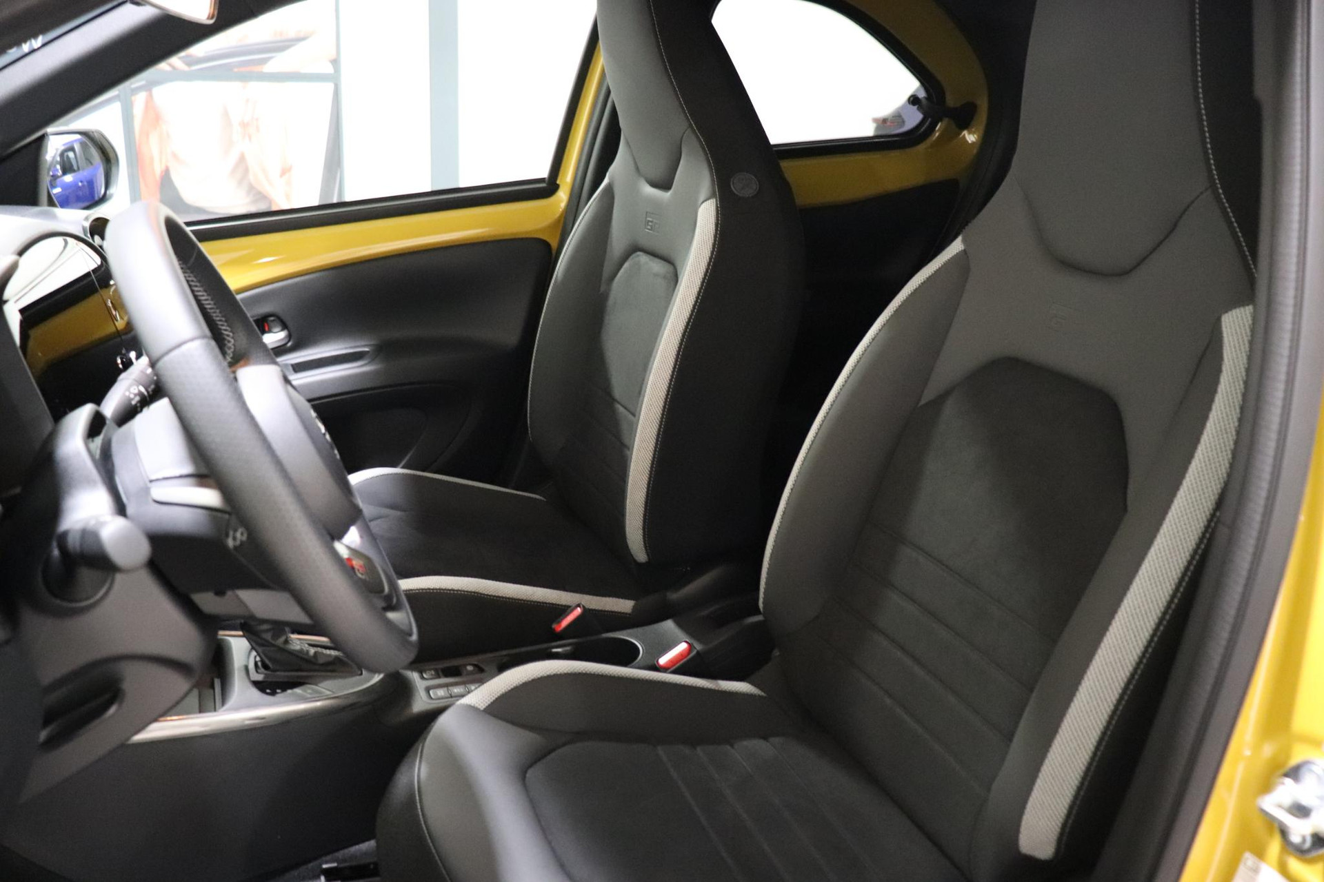 Nieuw in onze demovloot deze mooie Toyota Aygo X Hybrid 115 GR-Sport in de leuke combinatie: Mustard Yellow / Zwart dak.