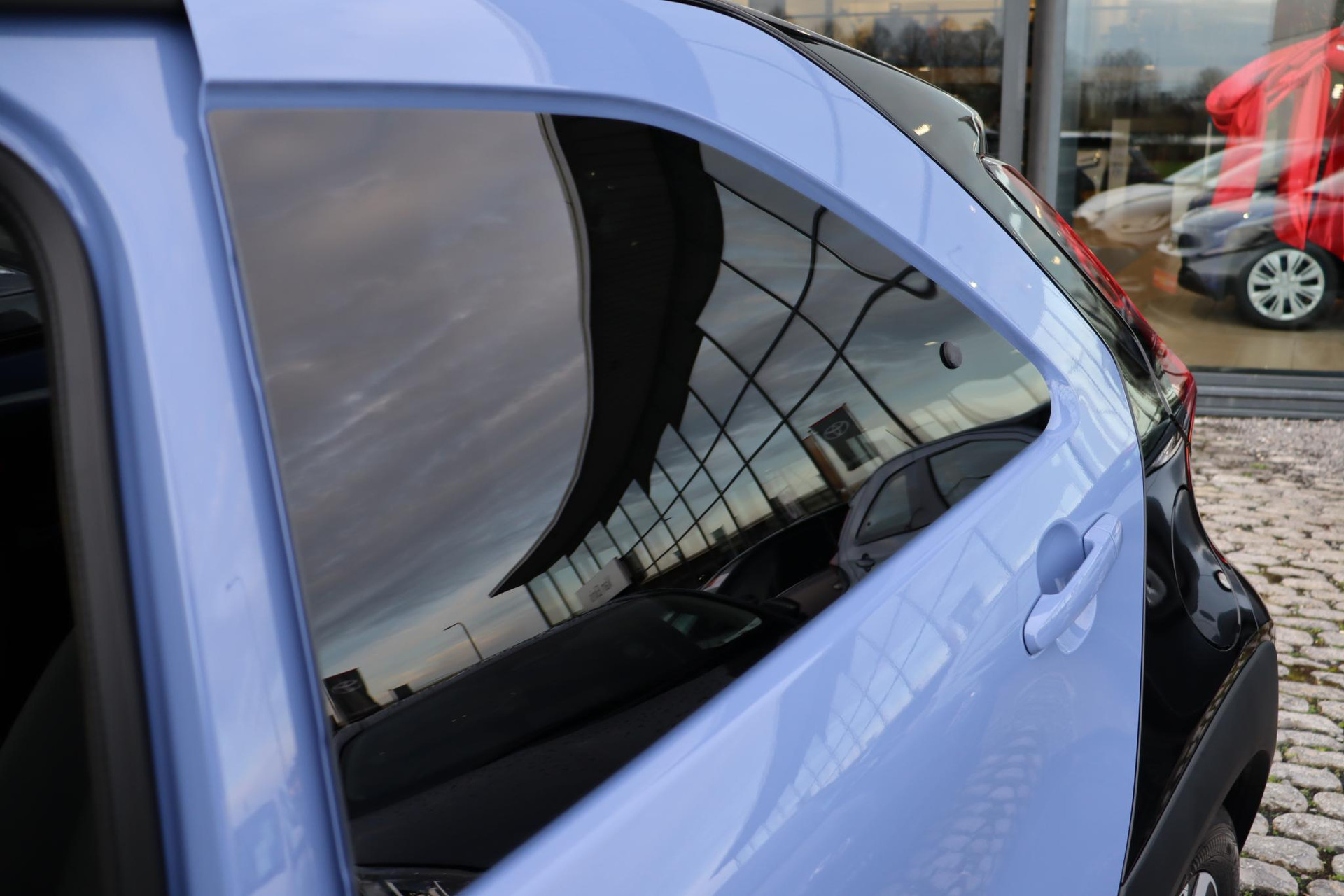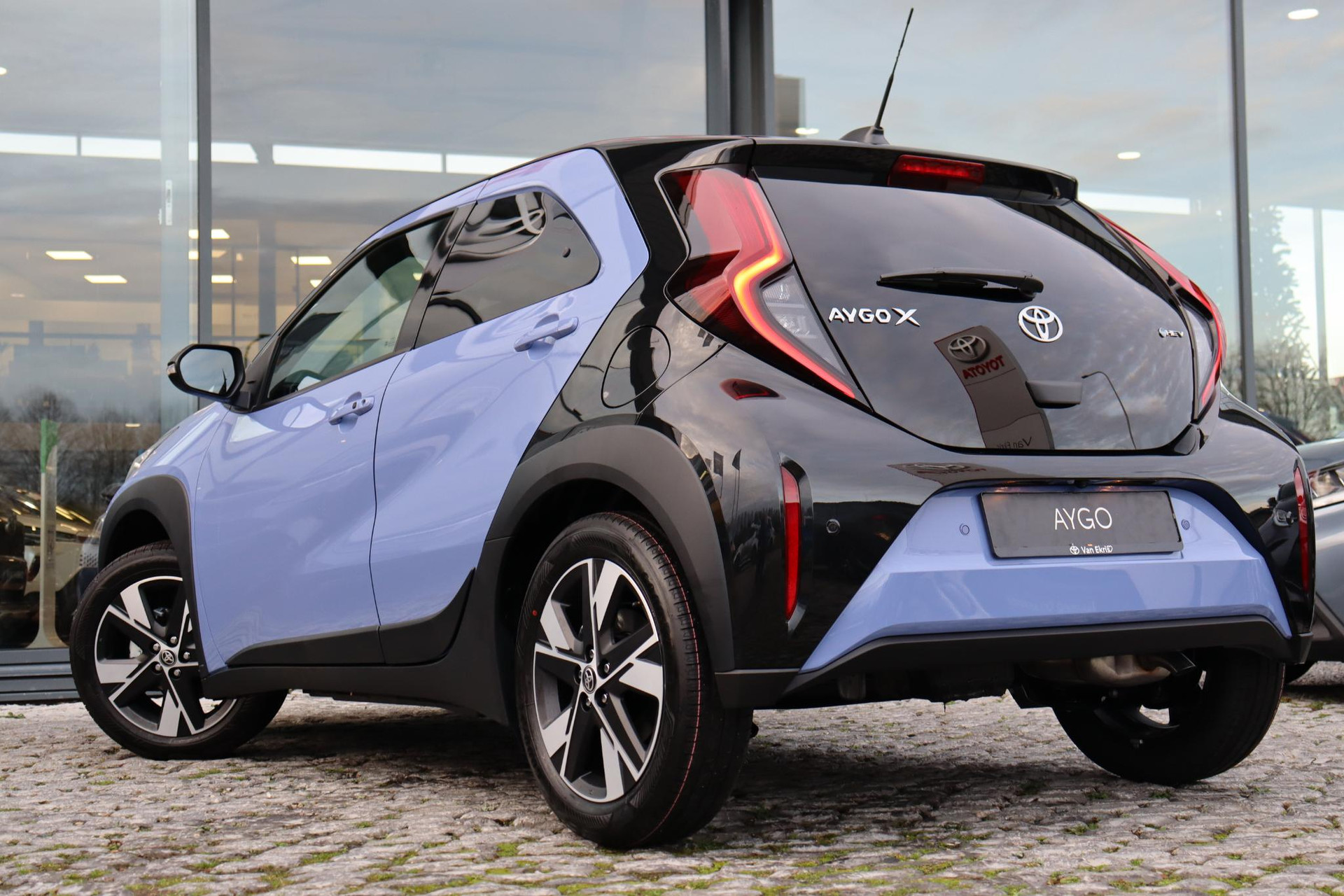 Prachtige Aygo X Hybrid Pulse in de exclusieve kleur Lavander met het prachtige Bi-Tone Zwart dak .