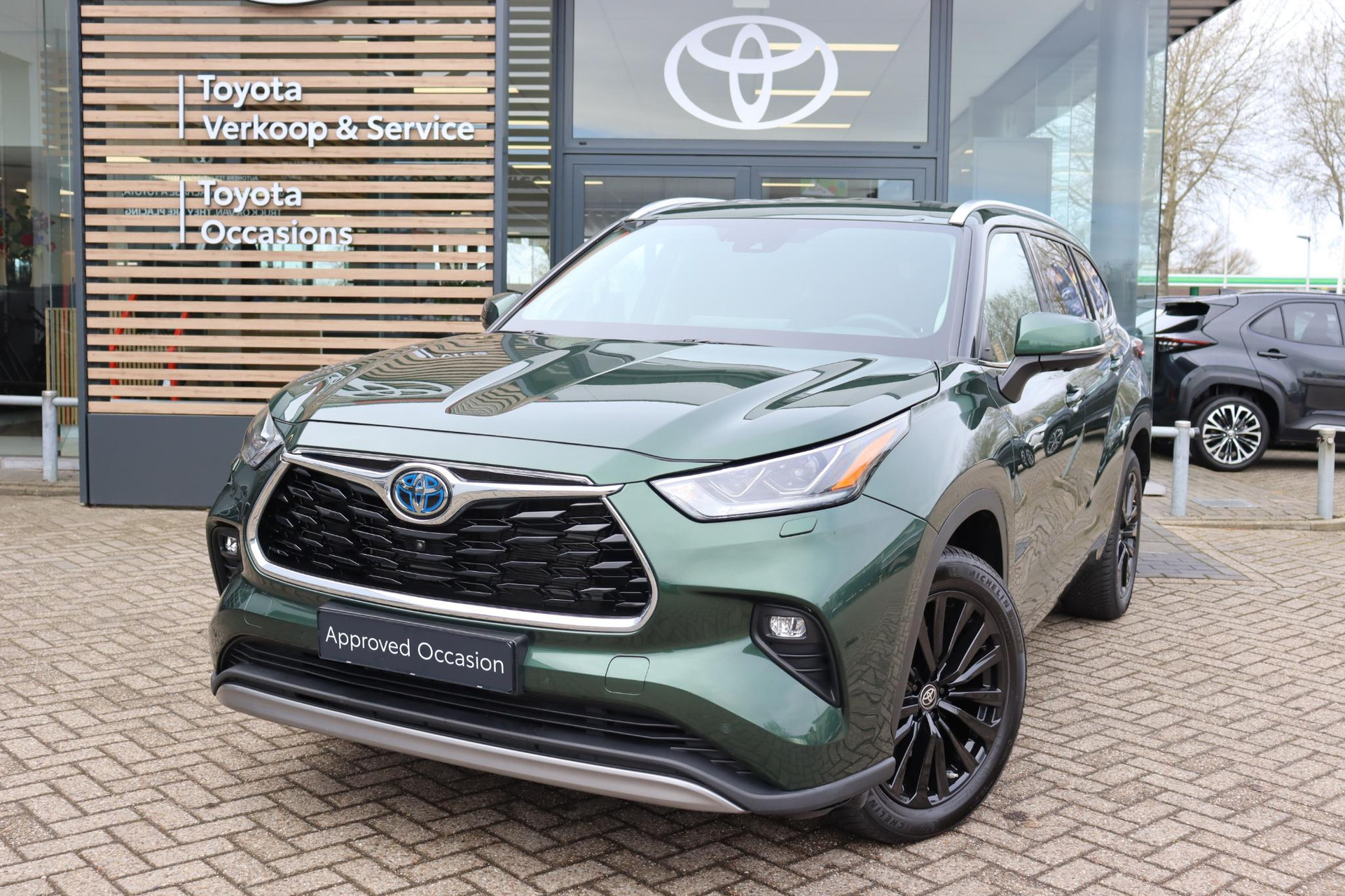 Prachtige mooie uitvoering van de Highlander AWD 7-Perosoons Premium in de kleur Cypress Green metallic i.c.m zwart lederen interieur.